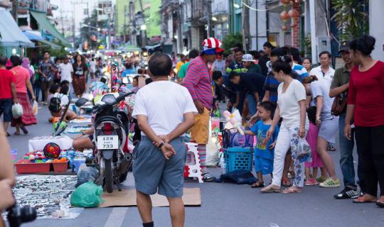 Today, I'm taking you to Had Yai Walking Street in Songkhla province. It's a monthly market held on the 2nd Sunday of every month. The atmosphere is very pleasant for walking around. It's located on Nang Ngam Road, which is a famous old town area of Songkhla. There are many check-in points, such as the Red Rice Mill, which everyone who comes here must take a picture of. Behind it is the sea with beautiful views. Inside the market, there are many things to see. Let's take a look inside the market together.