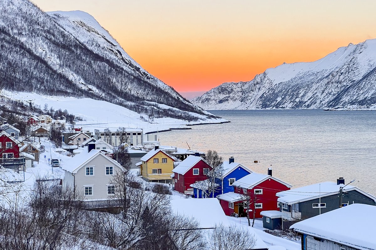 Fjordgård is a small fishing village on Senja Island in northern Norway, surrounded by mountains and fjords. Besides being a popular spot for viewing the Northern Lights, during winter it's covered in pure white snow, like a village from a Christmas tale (with only 4 hours of daylight). The atmosphere is incredibly peaceful and romantic (really quiet - on the day I visited, we barely saw anyone, haha).