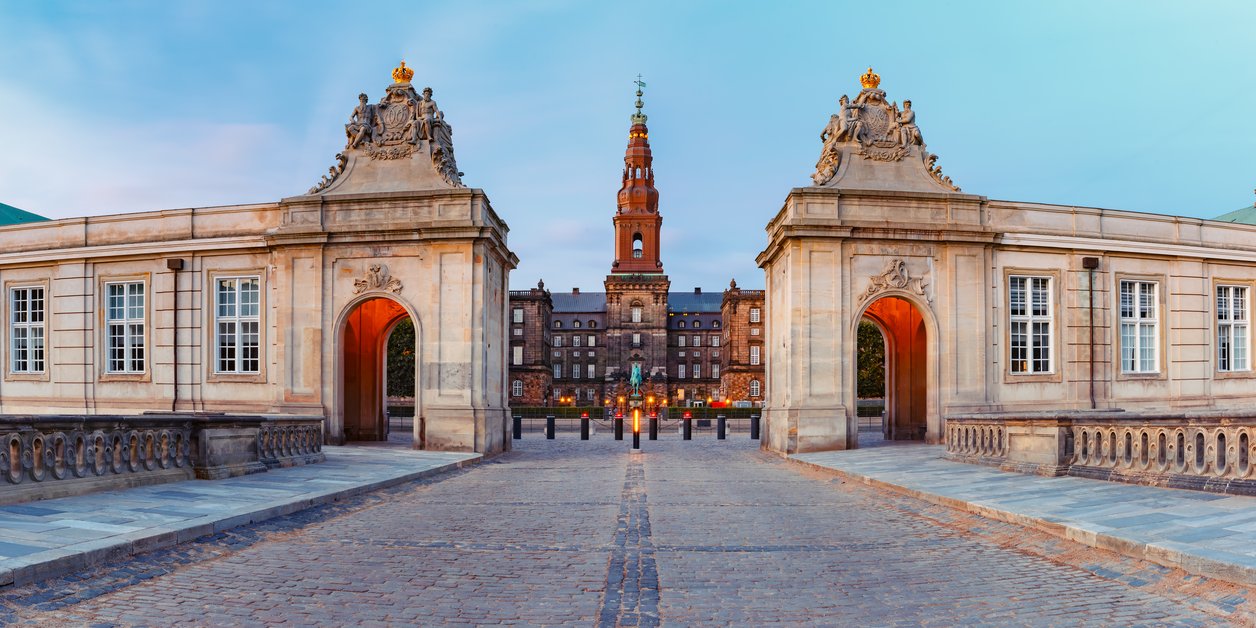 The main entrance to Christiansborg Palace, with two Rococo pavilions beside the Marble Bridge, in the morning in Copenhagen, the capital of Denmark.