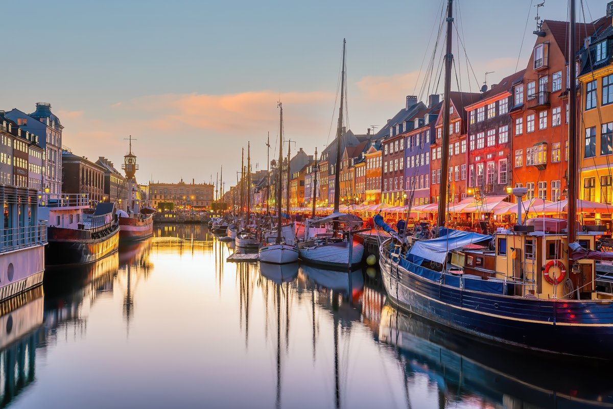 Enjoy the charming sunset at Nyhavn, the old harbor in the heart of Copenhagen.